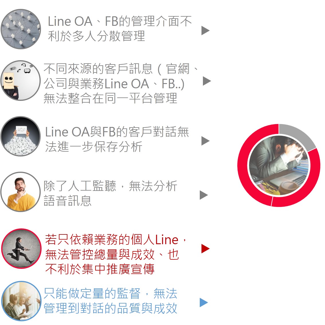 - 需要從客戶對話創造商機(提升轉換、預防流失 、優化服務、精準投放)